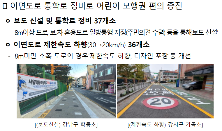 2024년 2월 18일 서울시에서 "2024 서울시 보호구역 종합관리 대책"을 발표했다. 이 대책의 내용 중 우리가 눈여겨 보아야 할 내용은 어린이보호구역(스쿨존) 내 폭이 좁은 이면 도로(8m 미만) 중 50곳을 추가로 선정하여 속도 제한을 변경한다는 내용이다. 현행 30km/h에서 20km/h로 속도제한이 변경된다.