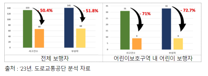 위와 같은 통계를 보였기에 적절한 대처를 통해서 어린이 교통사고를 막을 수 있었으면 한다. 다만 보호구역 4대 핵심분야에 연간 485억을 투입하겠다고 밝힌 만큼, 아무쪼록 올바르고 좋은 방향으로 지원금이 사용되었으면 한다.