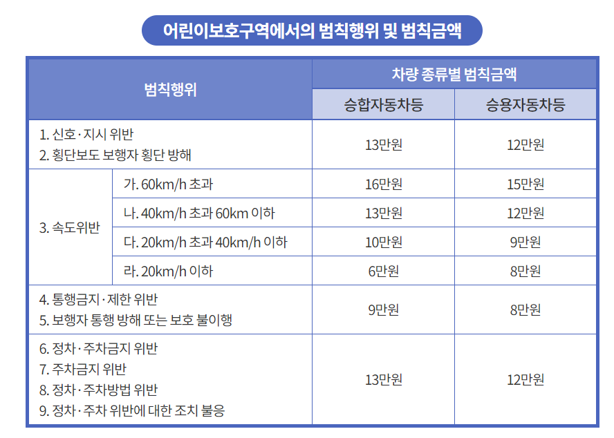 스쿨존 범칙행위 및 범칙금액