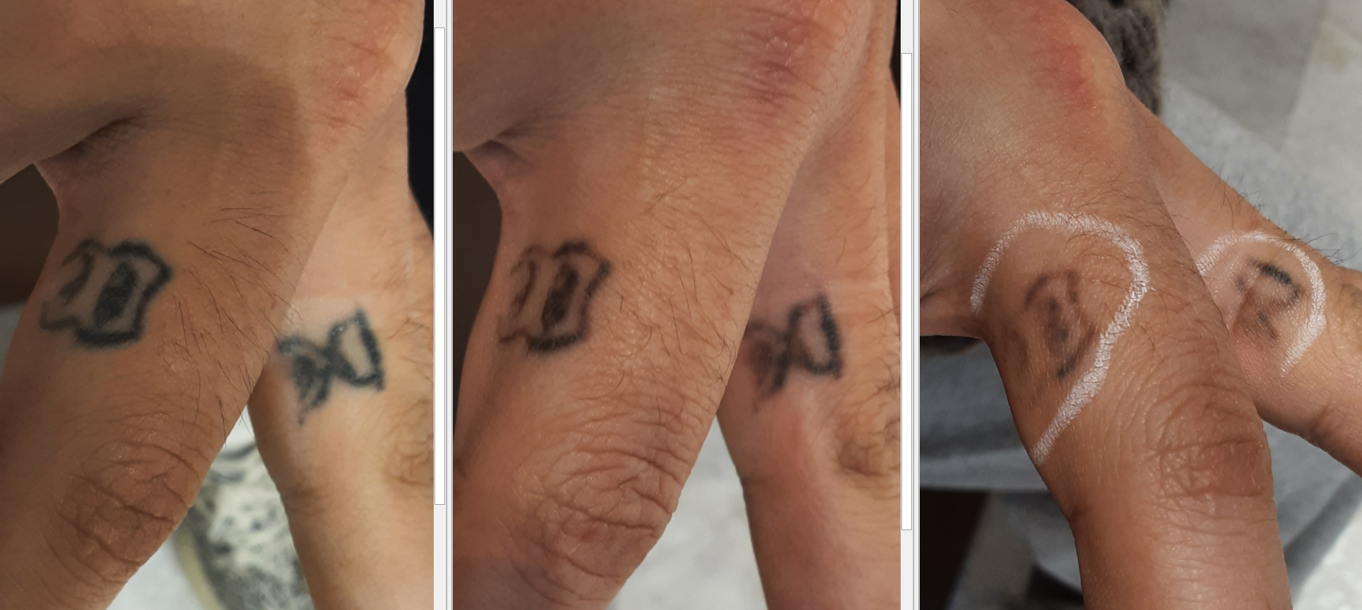 아래 문신은 사실 진한 문신이었는데, 처음, 1회 진행 후, 3회 진행 후 사진 입니다. 아직 몇 번 더 진행해야할 것 같아요.