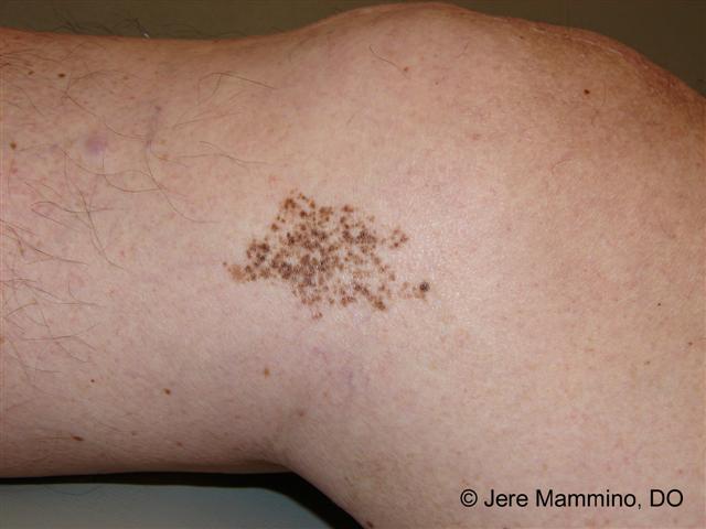 쉽게 말해서, "밑 바탕이 되는 넓은 갈색 반점 + 그 위에 있는 작은 점"이 복합적으로 조합되어 있는 모반 입니다.