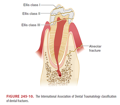 외상으로 인해 치아가 빠졌다거나 부서진 경우에 응급실 방문이 필요한 경우가 있습니다. 치아가 부러진 경우 응급실 방문이 필요 없는 경우도 많아요. 그 기준으로는 pulp 노출입니다. 위의 사진에서 Elis class III의 경우 빠른 치과적 처치가 필요한 단계입니다.