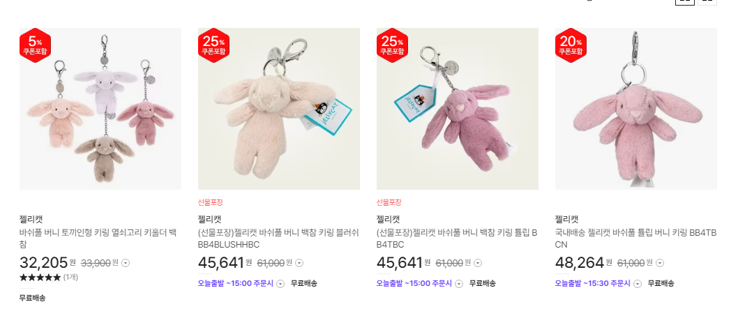 당일, 하루 이틀 만에 선물을 빠르게 준비하셔야 한다면 네이버 쇼핑을 이용하는 것도 좋은 선택지가 될 수 있습니다. 하지만 원하는 키링의 재고가 없는 경우가 거의 대부분입니다. 재고가 있는 제품을 선정하시는 쪽을 선택하셔야 합니다.
